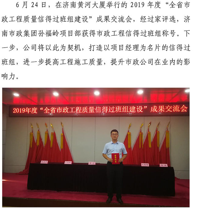 濟(jì)南市政集團(tuán)項(xiàng)目部獲得山東省質(zhì)量信得過(guò)班組